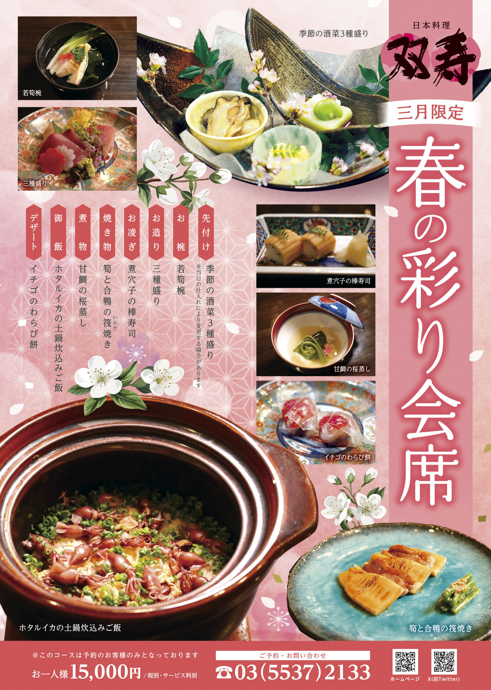 双寿では、3月から1か月間、秋の食材をふんだんに使用した特別会席「春の彩り会席」をご用意いたしました。